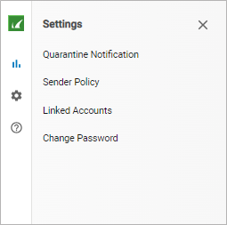 . Under Settings, you can set quarantine notifications, add sender policies, add linked accounts, and change your password.