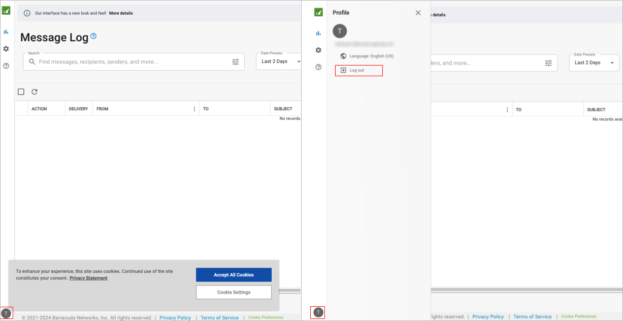 To log out of Email Gateway Defense, click on your profile at the bottom left corner and select Log out. Note that the profile icon may be hidden behind the cookies consent popup.