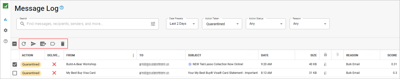 Use the Message Log to manage mail. The Message Log page displays all email messages that come through Email Gateway Defense to your account. You can filter messages using the Search bar and the Date Presets, Action Taken, Action Status, and Reason drop-down menus. Note that messages are deleted after 30 days.