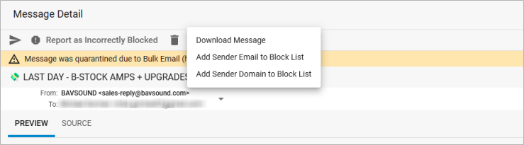 - Block List – Click to have the sender added to the block list.