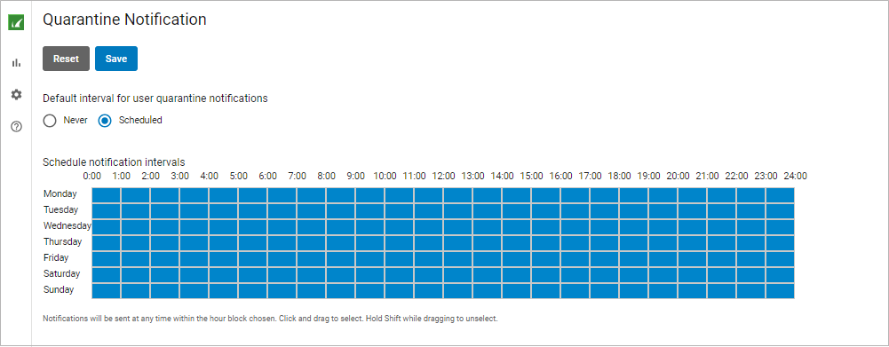 You can direct Email Gateway Defense to notify you by email when you have quarantined messages. On the Settings > Quarantine Notification page, select Scheduled. Click and drag in the Schedule notification intervals section to set the day and time for quarantine notification email delivery. Click to clear a selection. Alternatively, select Never if you do not want to receive quarantine notifications. Click Save to save your settings. Click Reset to remove your settings and start over.