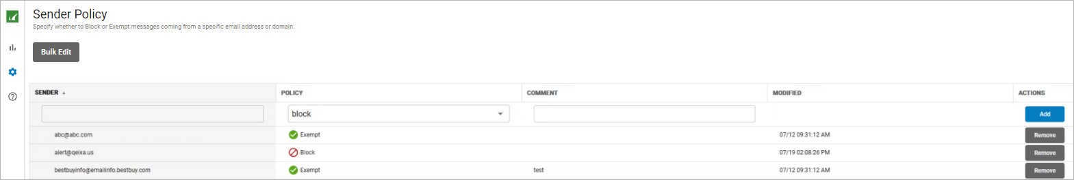 - To remove a policy, click Remove in the Actions column for the sender policy you want to remove.