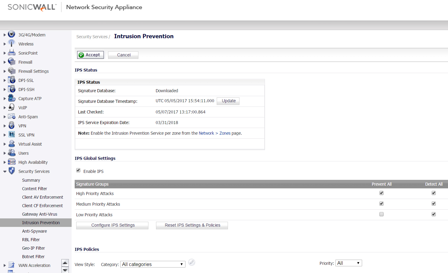 - Click on POLICY, Navigate to Security Services | Intrusion Prevention. Ensure that your settings mirror the screenshot below.