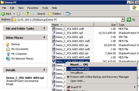 Browse to your backup image path (in this example, our backup path is \\192.168.0.250\backup\Demo PC) and right click the Shadowprotect Incremental file (spi) that you want to restore from and select "quick mount".