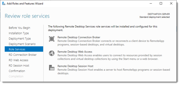 Although Quick Start might be a valid option for a single server deployment, leave the default selected. This will explain the steps necessary to install Remote Desktop Services in greater detail.Click Next.