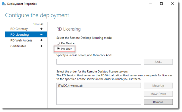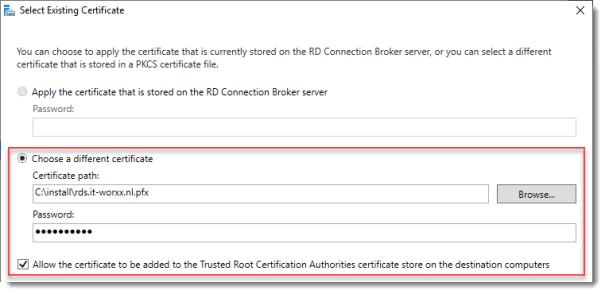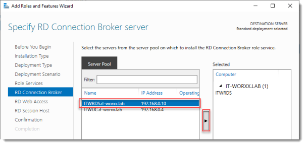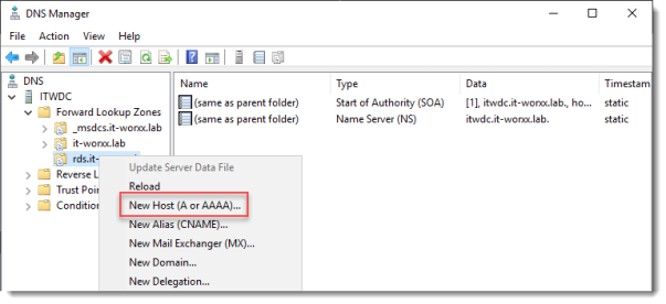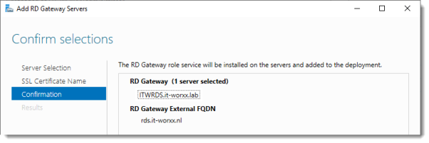 Now the configuration will be able to resolve “rds.it-worxx.nl” to the server holding the Connection Broker role, and this will work because “rds.it-worxx.nl” is also on the certificate that we will configure later.