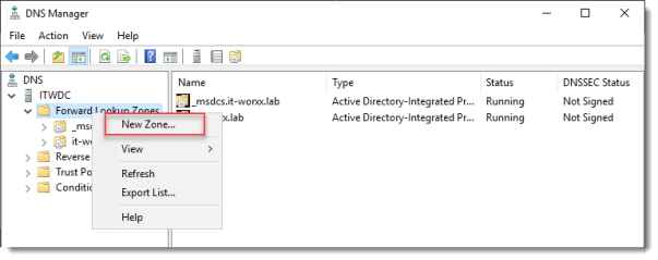Open DNS Manager on the domain controller and browse to Forward Lookup Zones.