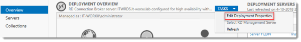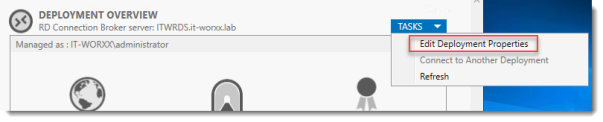 In Server Manager, Remote Desktop Services, Overview, click Tasks and click Edit Deployment Properties.
