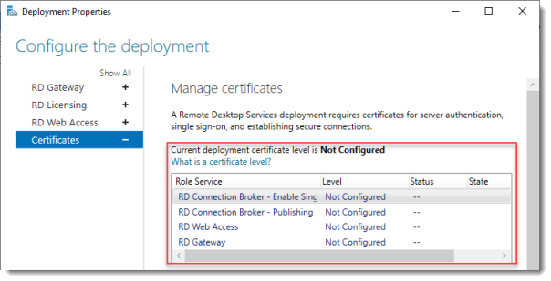 Also notice that even more certificate configuring is needed, but we’ll get to that later. Pay no attention to it for now. The same goes for the RD Gateway properties for the deployment. We’ll get to that later.