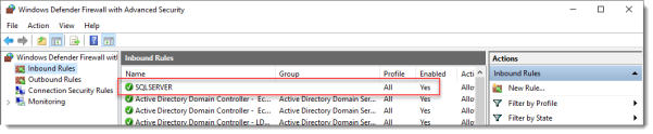 I added the SQL Server executable to the exception list to allow all inbound traffic, but TCP 1433 inbound should suffice.