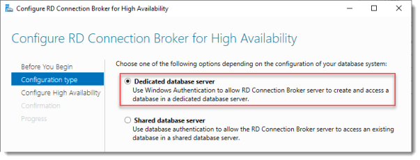 The next steps in re-configuring the RD Connection Broker depend on an SQL database shared by all Connection Brokers in the deployment. Without this configuration the RD Connection Broker will rely on the Windows Internal Database that was created during the initial deployment of the roles.