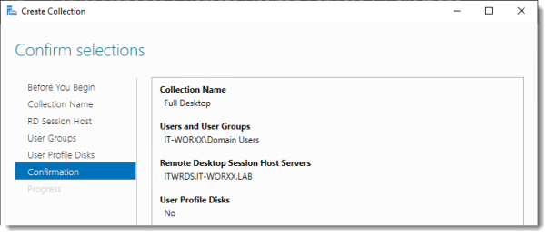 User profile disks are not in focus in this guide. Since I have no file shares configured in this setup, uncheck Enable user profile disks for now.