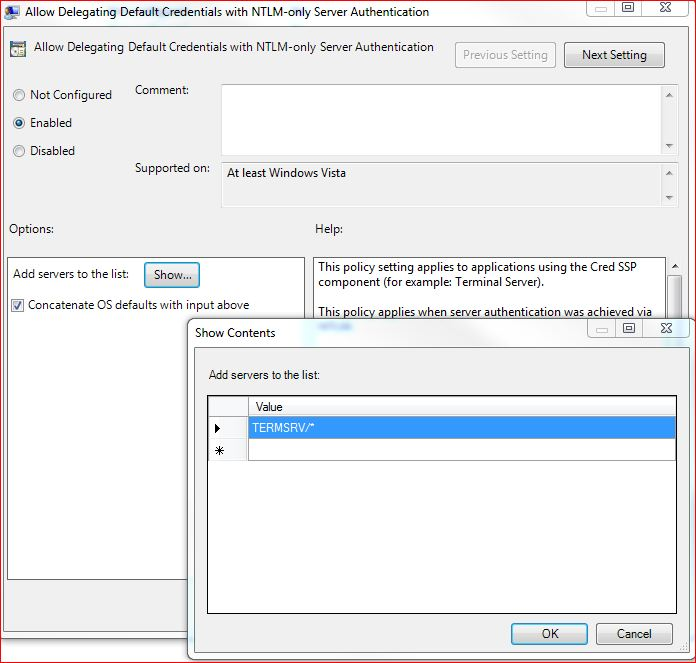 Enable the each shown policy and then click on the “Show” button to get to the server list and add TERMSRV/* (or alternatively just *) to the server. In my case it’s ‘*’ which indicates that cached credentials will be allowed to all servers.